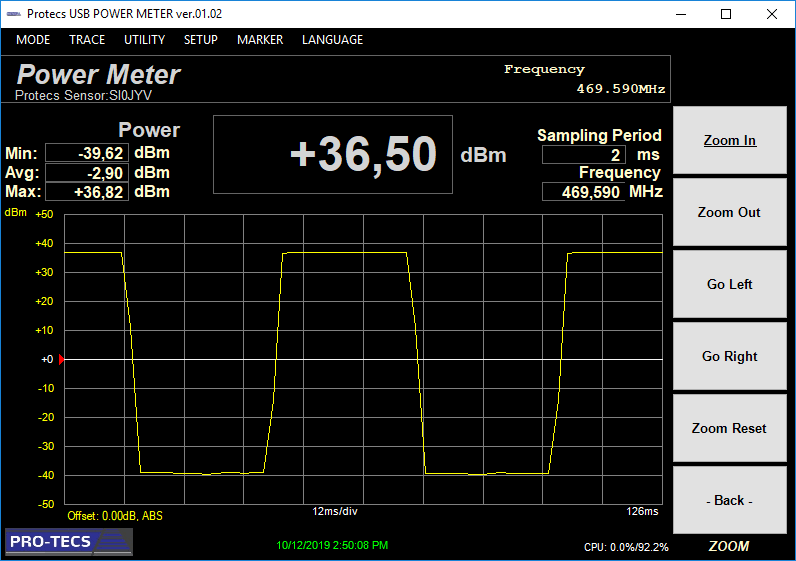 Bei digitaler Sendeleistung werden die Leistungspulse dargestellt. Die Zeitachse ist für die Messung variabel einstellbar. So sind ganz einfach Pulslängenanalysen möglich. Zur Ermittlung der Pulslänge (oder der Pause zwischen den Pulsen) können Marker gesetzt werden.